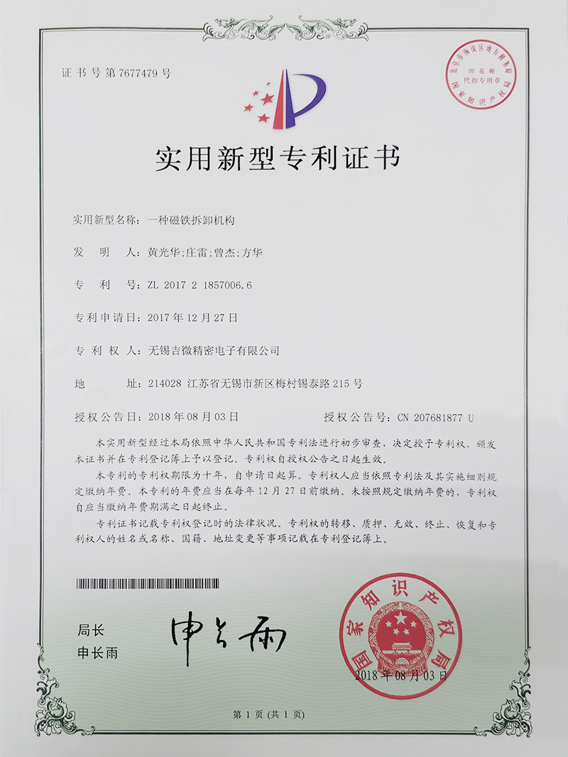 一種磁鐵拆卸機(jī)構(gòu)實(shí)用新型專利證書