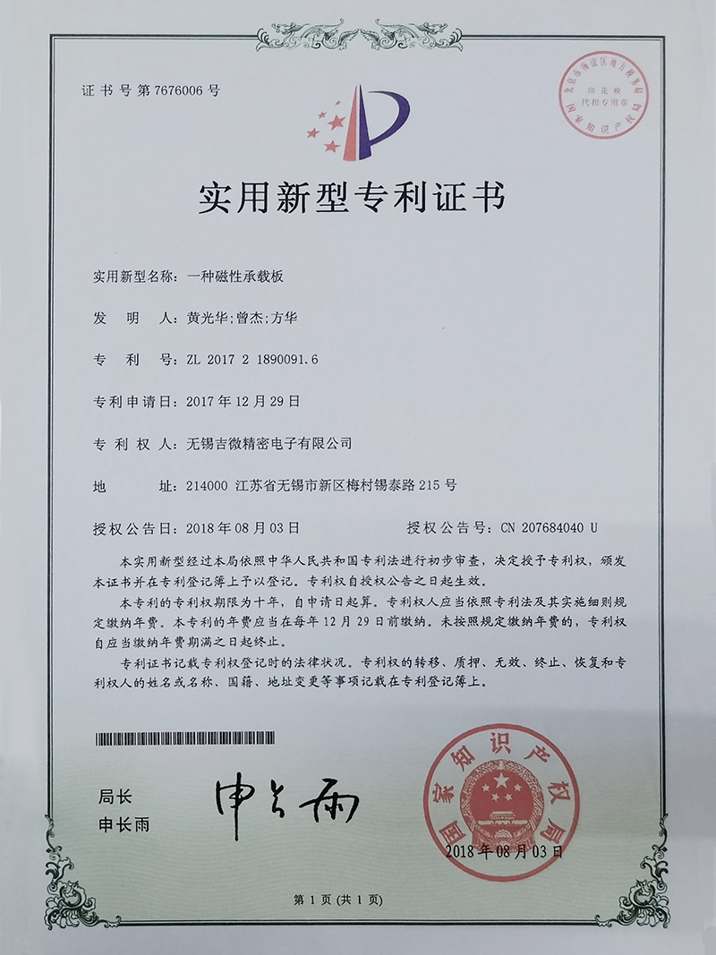 一種磁性承載板實(shí)用新型專利證書