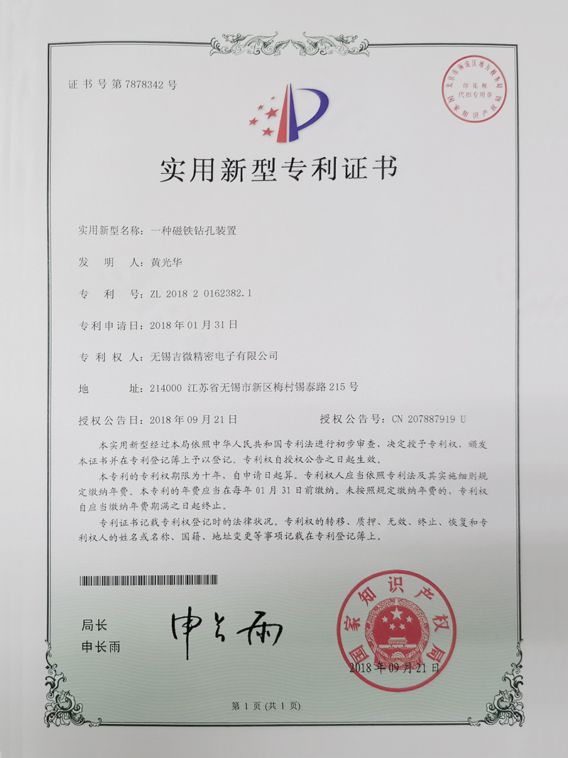 一種磁鐵鉆孔裝置實(shí)用新型專(zhuān)利證書(shū)