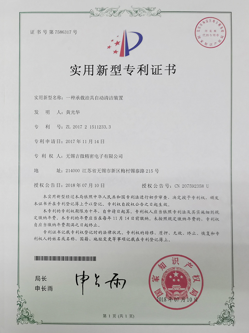 一種承載治具自動清洗裝置實(shí)用新型專利證書