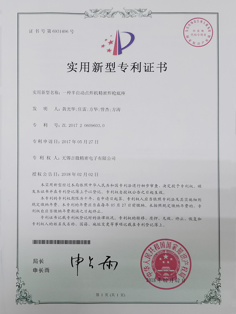 一種半自動(dòng)點(diǎn)焊機(jī)精密焊槍底座實(shí)用新型專(zhuān)利證書(shū)